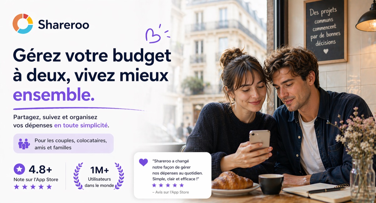 Shareroo est une app de budget partagé pour les couples, mariés ou non. Répartissez les dépenses, régularisez les avances, scannez les reçus avec l’IA et partagez listes de courses et tâches sans connexion bancaire.