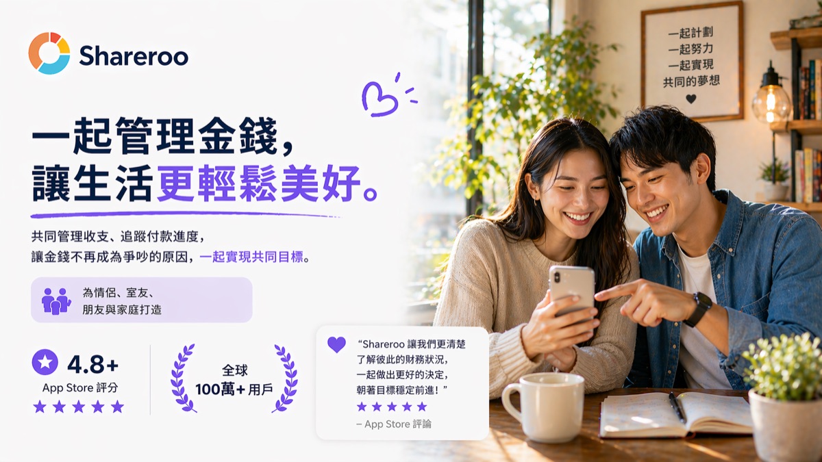 Shareroo 是專為情侶・夫妻設計的共享記帳 App。拆帳、代墊結算、AI 收據輸入、購物清單與待辦共享都能在同一處管理,無需綁定銀行帳戶。